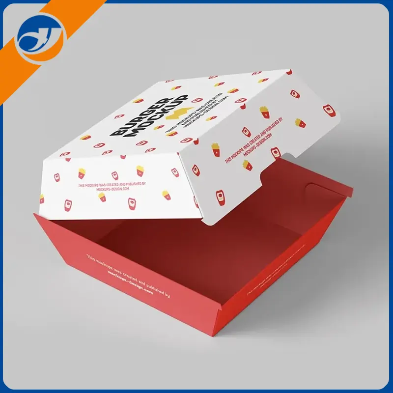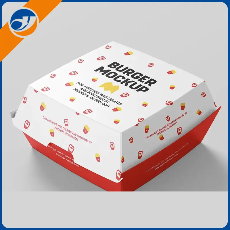 다채로운 햄버거 상자로고 및 슬로건과 같은 브랜드 요소를 디자인에 통합하여 브랜드 인식을 향상시키는 동시에 색상 심리학을 통해 식욕을 자극하고 식사 경험을 향상시킵니다.