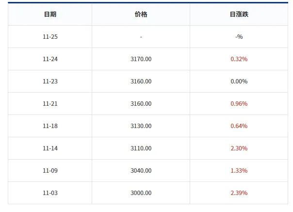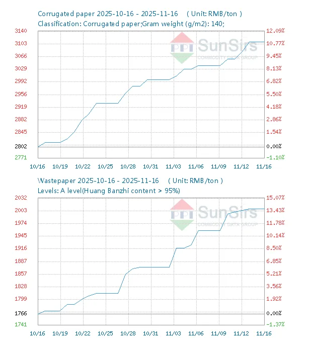 140g/m² 골판지의 경우 2025년 10월 16일부터 11월 16일까지 가격이 12.09% 상승했습니다. 더 긴 기간(8월 27일~11월 25일) 동안 누적 이익은 20.99%에 달했습니다. 11월 24일까지 최신 가격은 톤당 3,170위안에 도달했으며 소폭의 상승 조정이 계속되었습니다.